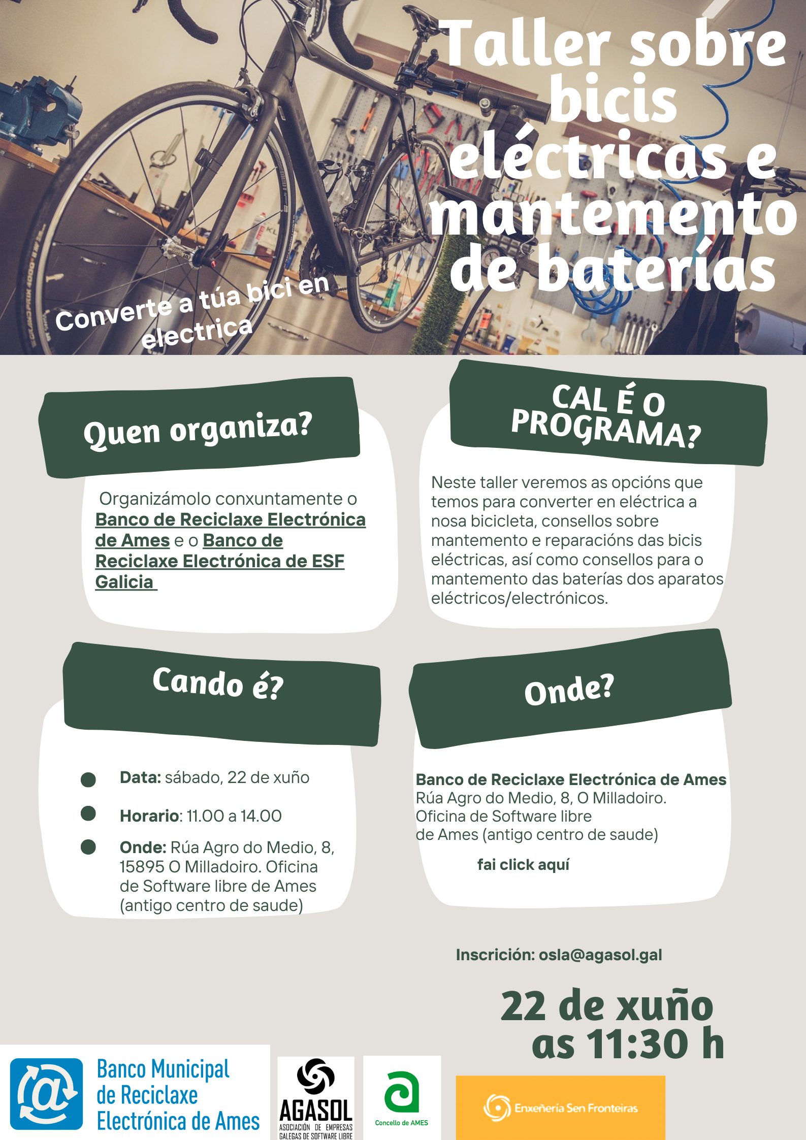Agasol organiza este taller o sábado día 22 de xuño, nel poderemos ver as opcións que temos para converter en eléctrica a nosa bicicleta, consellos sobre mantemento e reparacións das bicis, así como consellos para o mentemento das baterias dos aparatos eléctricos/electrónicos . Organizado conxuntamente polo Banco de Reciclaxe Electrónica…