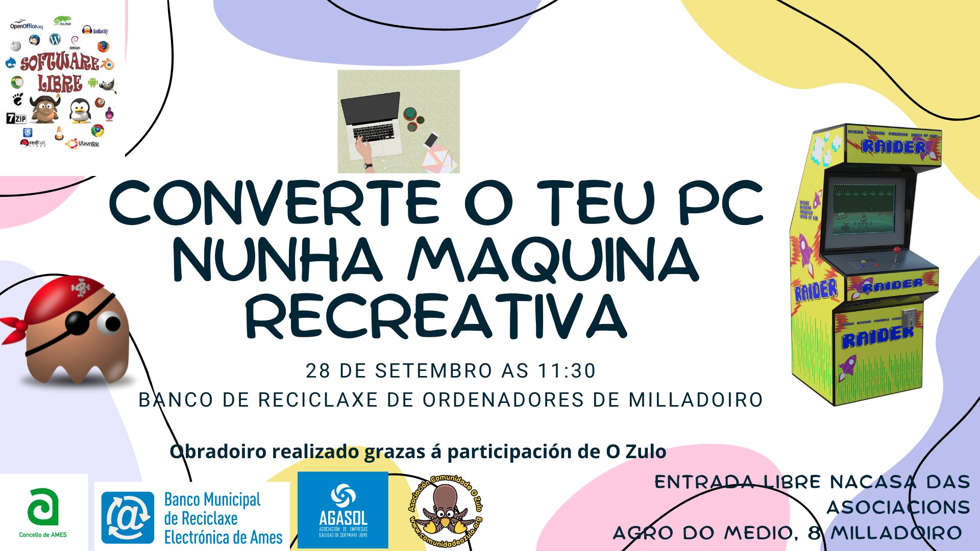 Agasol organiza o Obradoiro “Converte o teu PC nunha maquina recreativa” o día 28 de setembro de 11:30h a 13:30h. Obradoiro impartido pola Oficina de Software Libre de Ames dentro das súas actividades de divulgación das novas tecnoloxías en Software Libre. Se botas de menos aqueles tempos nos que pasabas…